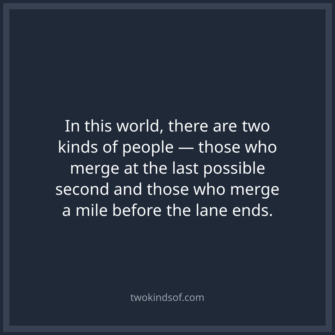 In this world, there are two kinds of people — those who merge at the last possible second and those who merge a mile before the lane ends.
