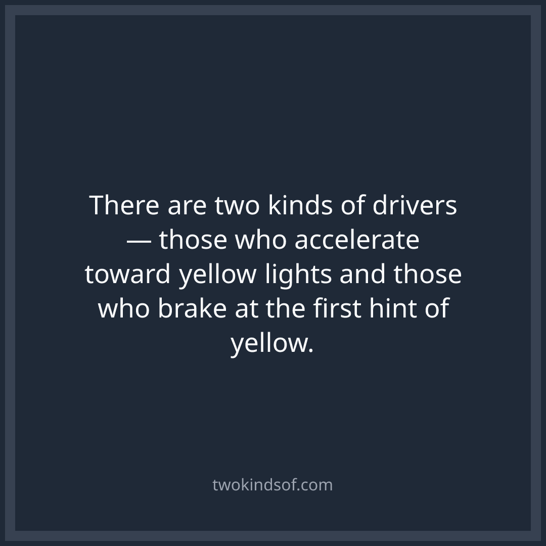 There are two kinds of drivers — those who accelerate toward yellow lights and those who brake at the first hint of yellow.