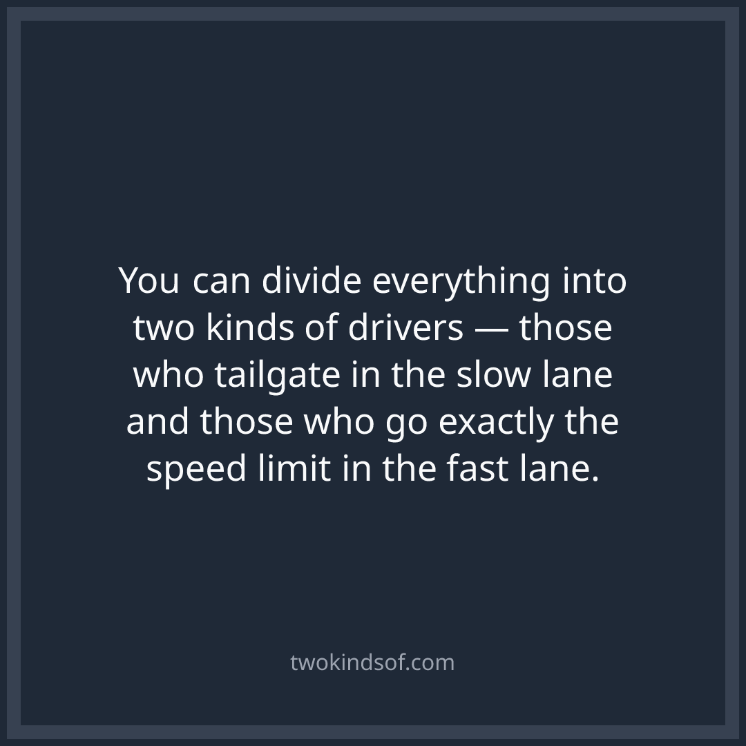 You can divide everything into two kinds of drivers — those who tailgate in the slow lane and those who go exactly the speed limit in the fast lane.