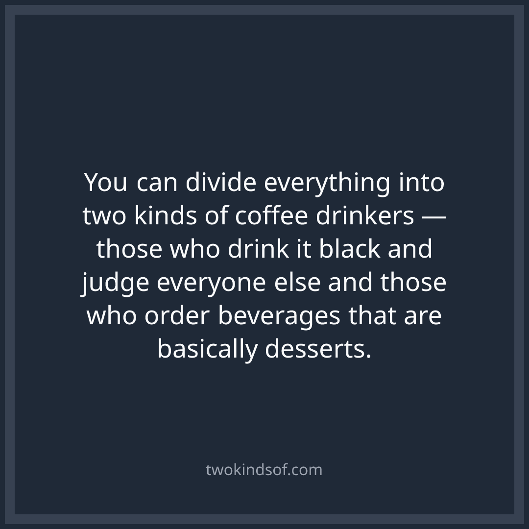 You can divide everything into two kinds of coffee drinkers — those who drink it black and judge everyone else and those who order beverages that are basically desserts.