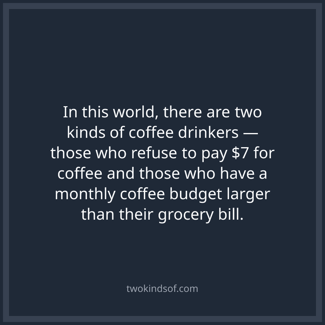 In this world, there are two kinds of coffee drinkers — those who refuse to pay $7 for coffee and those who have a monthly coffee budget larger than their grocery bill.
