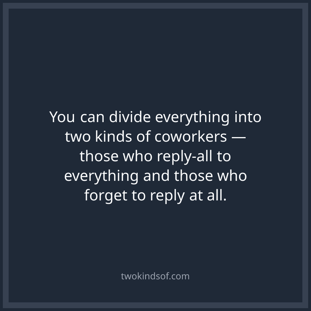 You can divide everything into two kinds of coworkers — those who reply-all to everything and those who forget to reply at all.