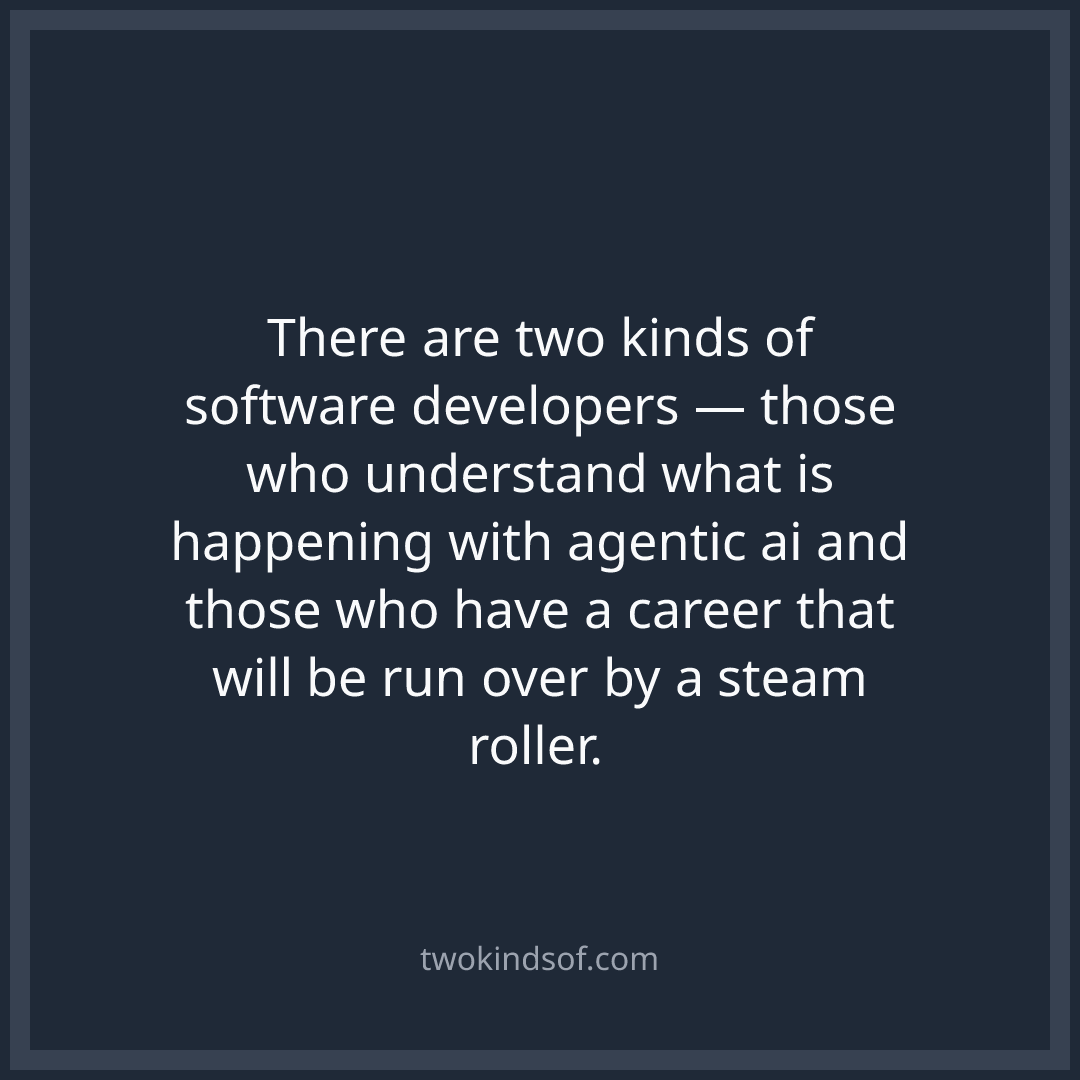 There are two kinds of software developers — those who understand what is happening with agentic ai and those who have a career that will be run over by a steam roller.